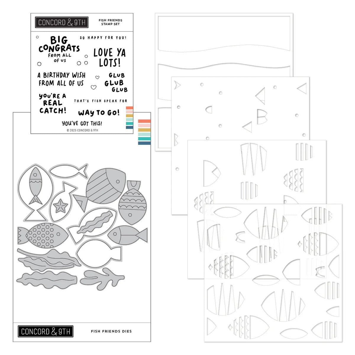 Create cards that will really make a splash with the Fish Friends Stencil Pack! Blend together a school of colourful fish and then cut them out with the coordinating dies and finish it all off with a few bubbly accents and a sentiment found in the Fish Friends Stamp Set.