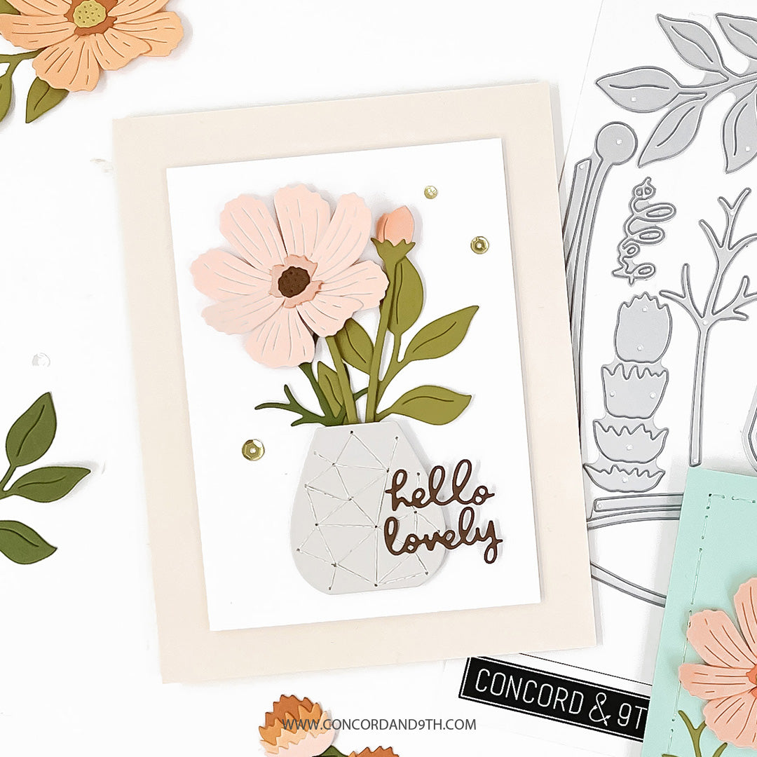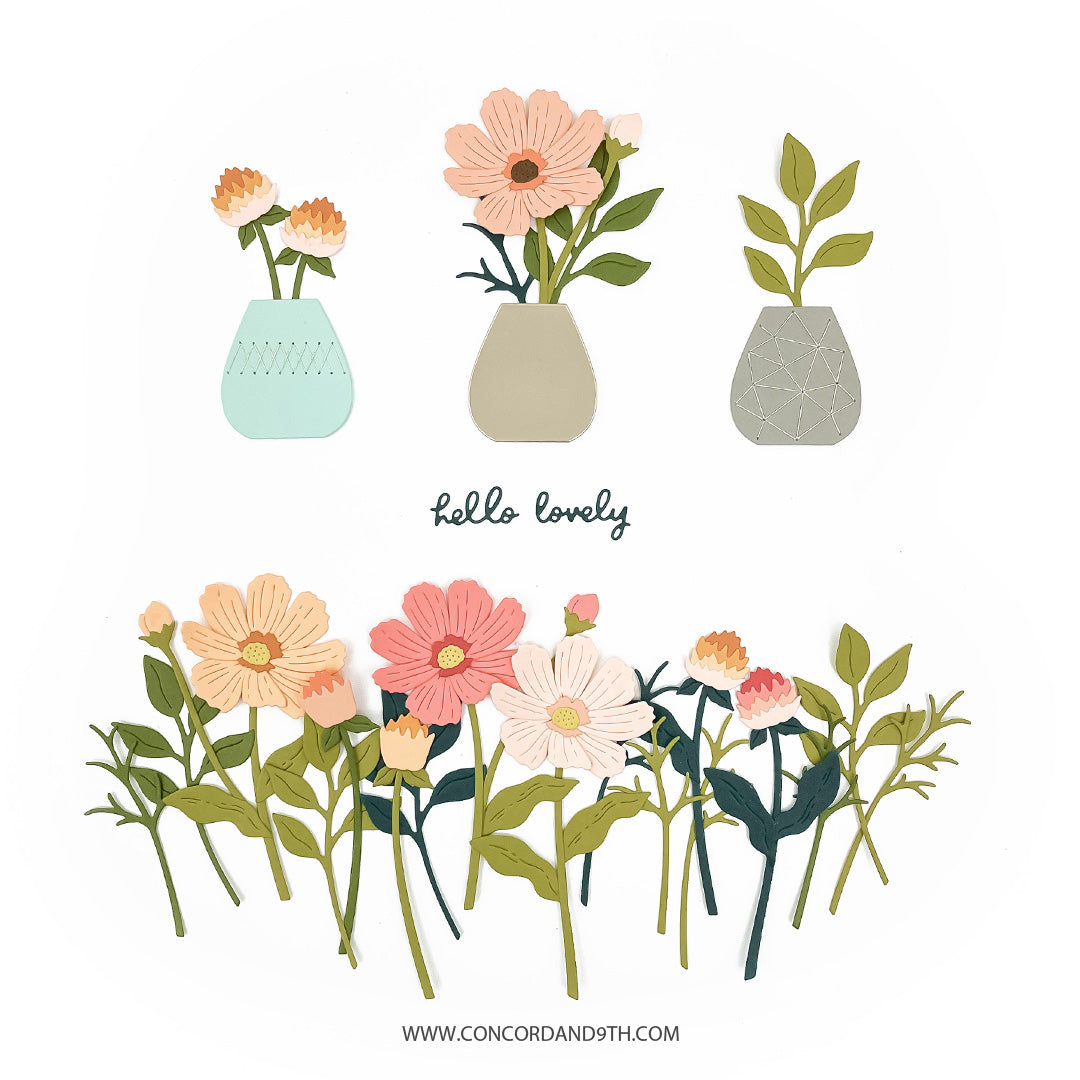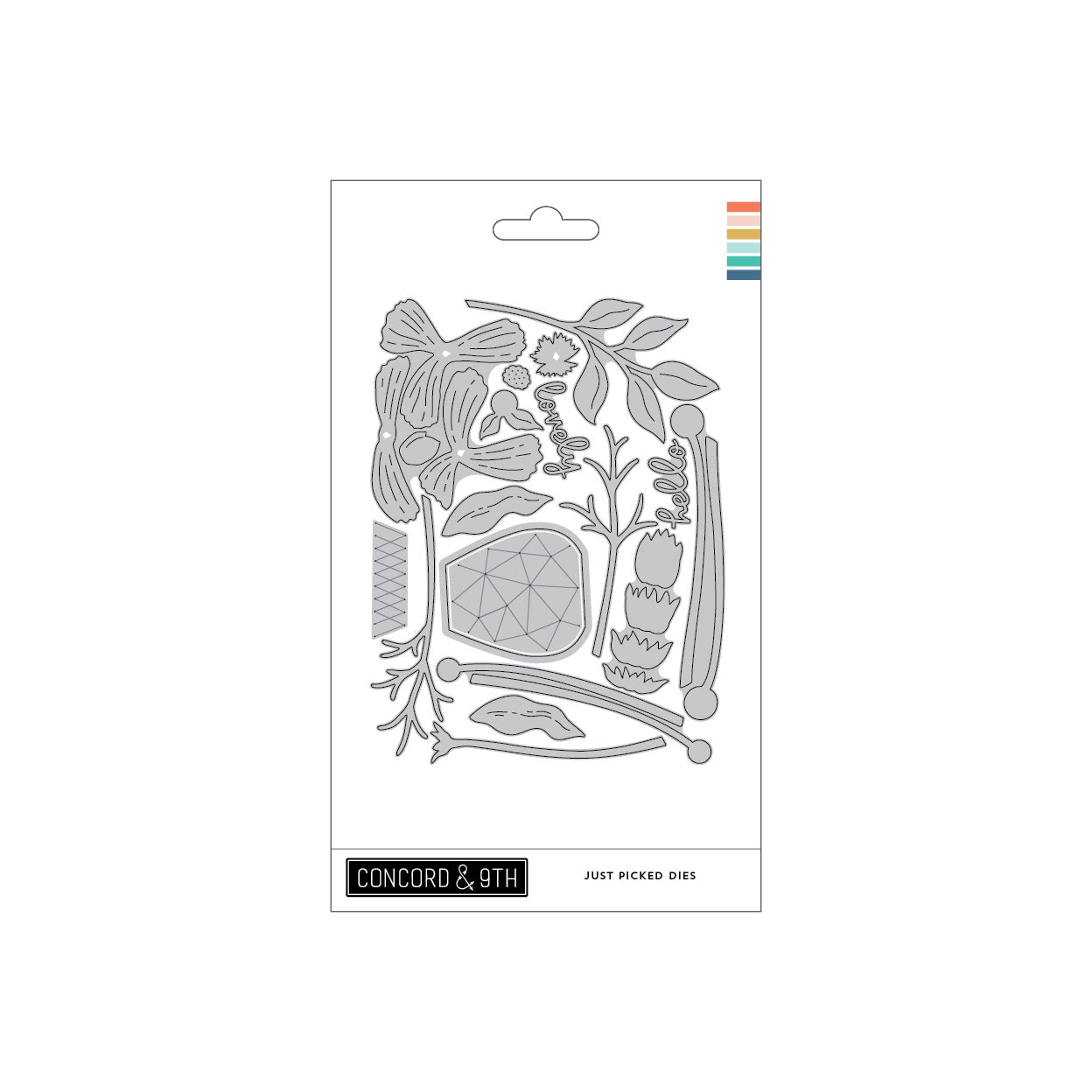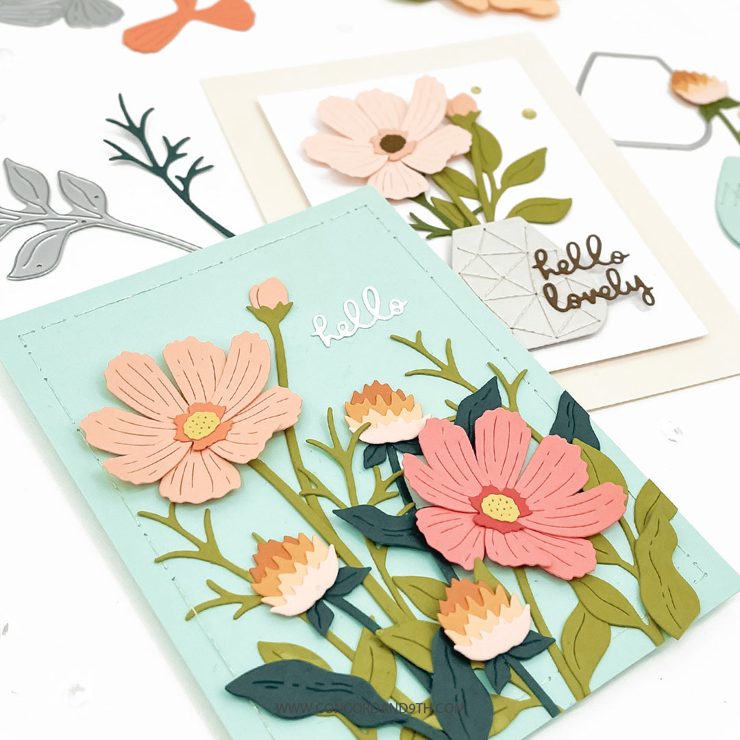 Mix, match, layer, and even stitch with the Just Picked Dies! This sweet set makes it easy to create cheerful, dimensional flowers for any project. The larger Cosmo flower die cuts four individual petals that you can assemble by aligning the center cutouts and adding the coordinating flower centers. The Globe flower is cut with a single pass through your die cutting machine and the pieces layer from tallest to shortest. There are stem and leaf options, plus a charming decorative pot. Take your card to the next level by using one of the piercing dies to create an easy-to follow stitching guide that allows you to add metallic designs to the pots.
