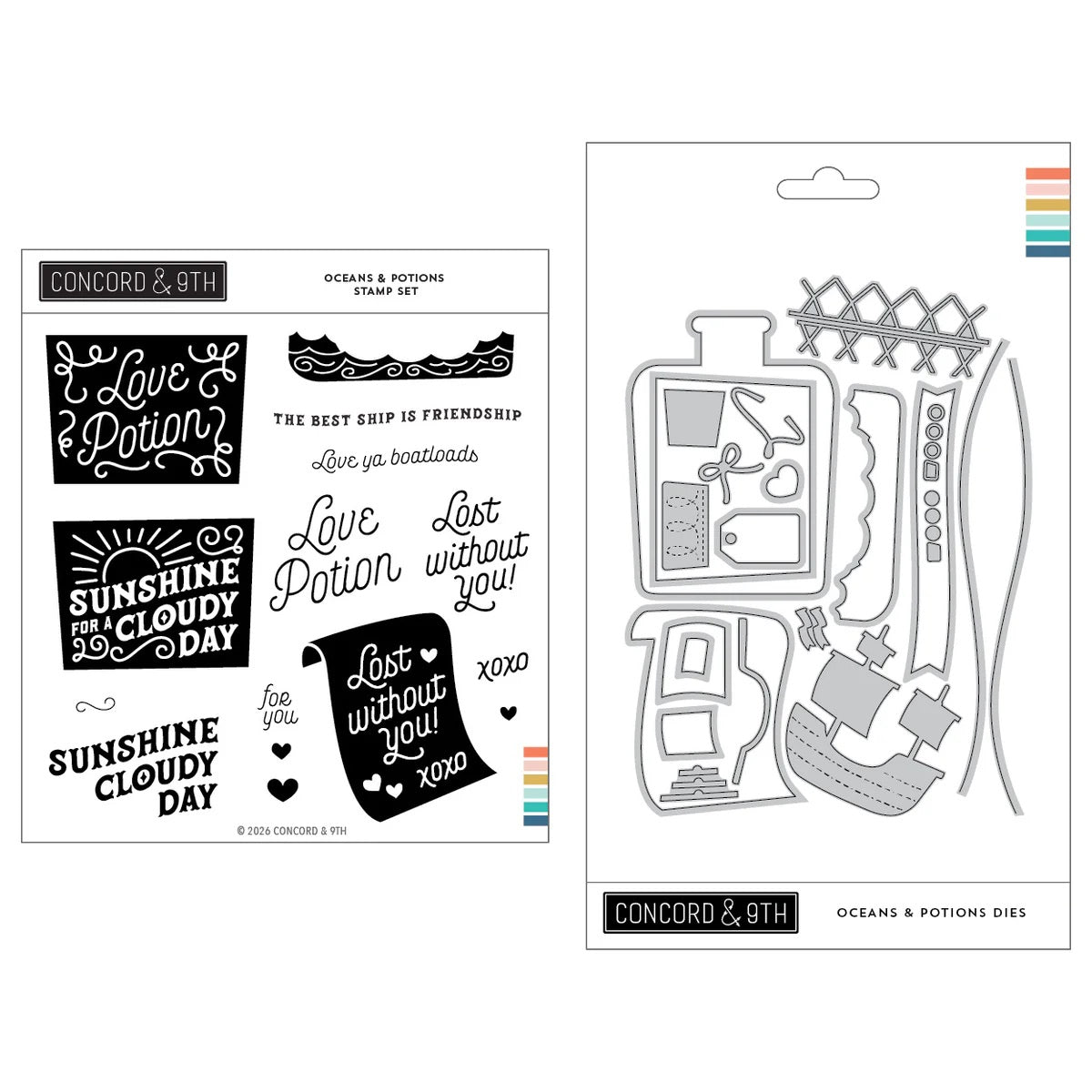 The Oceans & Potions Stamp Set pairs with the Oceans & Potions Dies to create spellbinding potions, classic messages in a bottle, and friendly ship-in-a-bottle scenes that are sure to bring heart and touch of wonder to your next project.