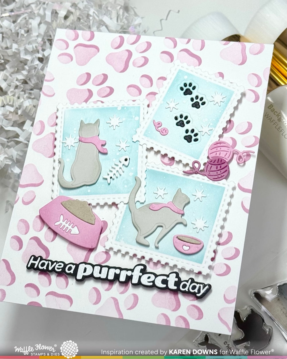 Create playful cat scenes with the Postage Collage Cat Silhouettes Dies. This set includes a variety of cat shapes and small accessories to mix and match. The scale of these dies works seamlessly with the Postage Collage series or can be used on their own in your designs.