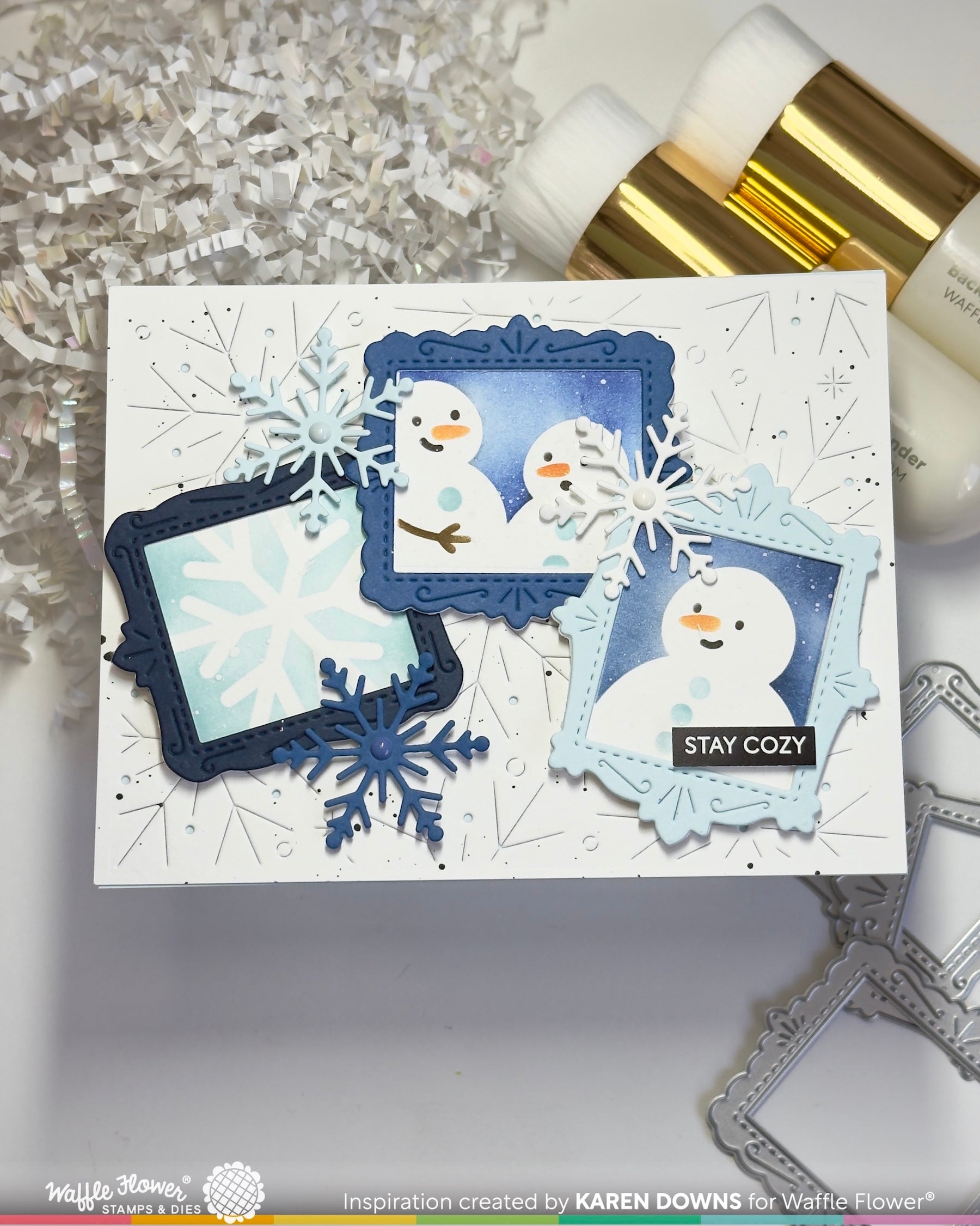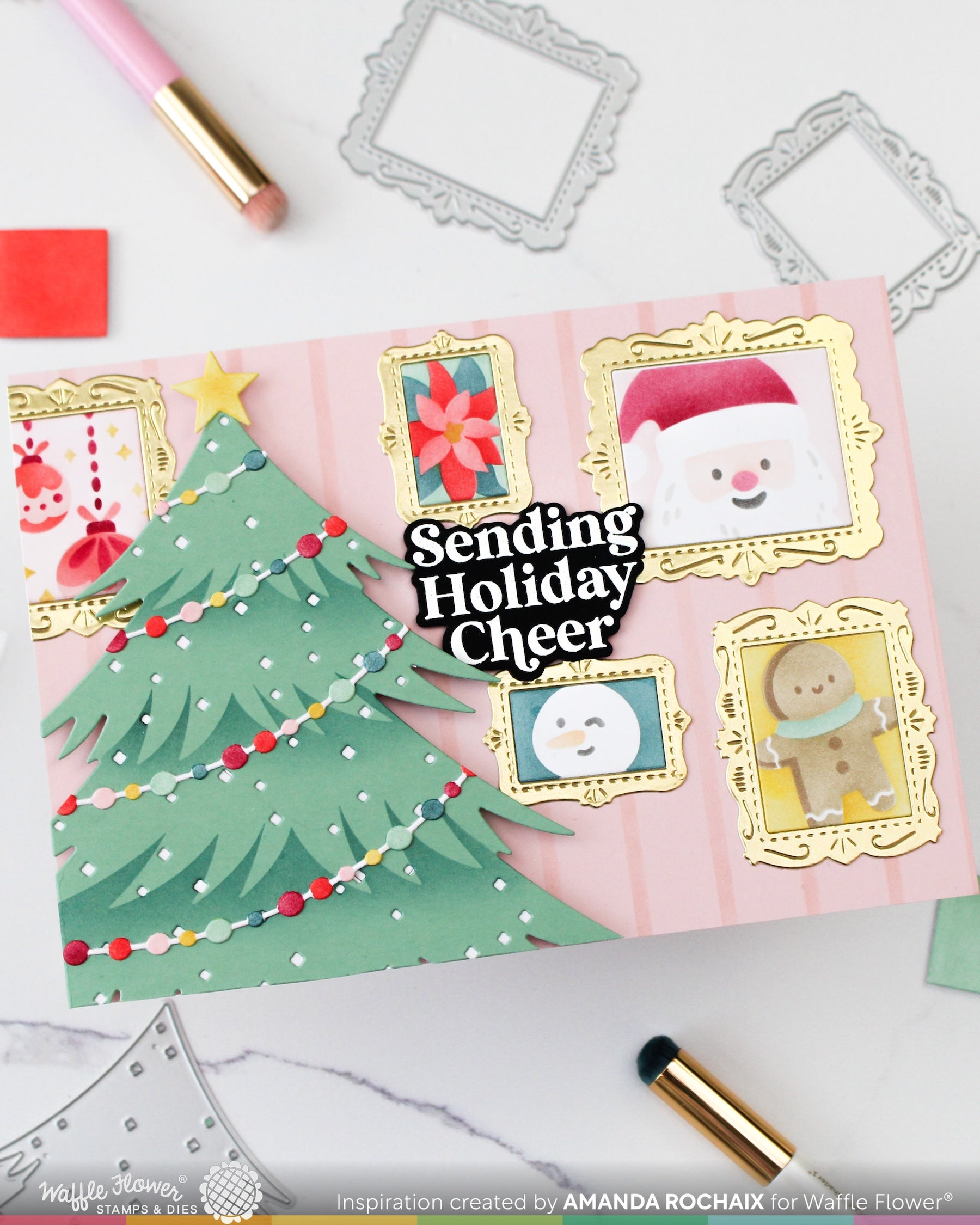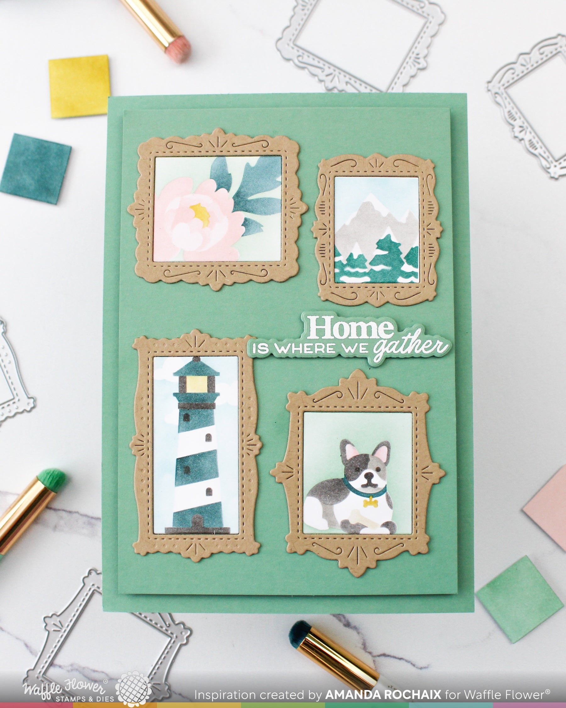 Just when you thought the postage collage range from Waffle Flower couldn't get any more versatile, they thought of another fun way to use it! This frames die lets you turn all your collage cuts into gorgeous framed artwork for your cards or scrapbook projects. Use one on its own as the central focal point on your card or create a gallery wall with all your favourite stamps or stencils featured as the art work! There's even picture hangers to hang them on your project!